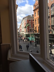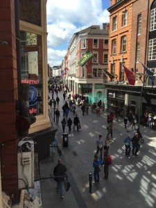 We went to Trinity College and learned their next tour of the college including a tour of the old library and the Book of Kells Exhibit was in about half an hour so we decided to find something to eat and come back. We headed down Grafton Street, which is the local street mall in Dublin, found a McDonald’s of all things, and sat on the second floor by the windows so we could watch the street scenes below. It was the perfect place! If you want a snapshot of modern Dublin life, this window was perfect!