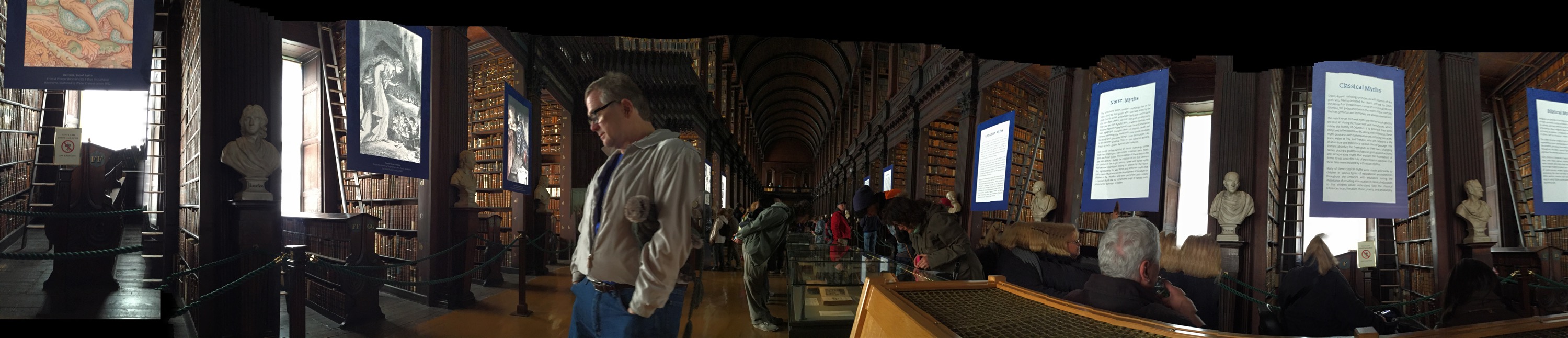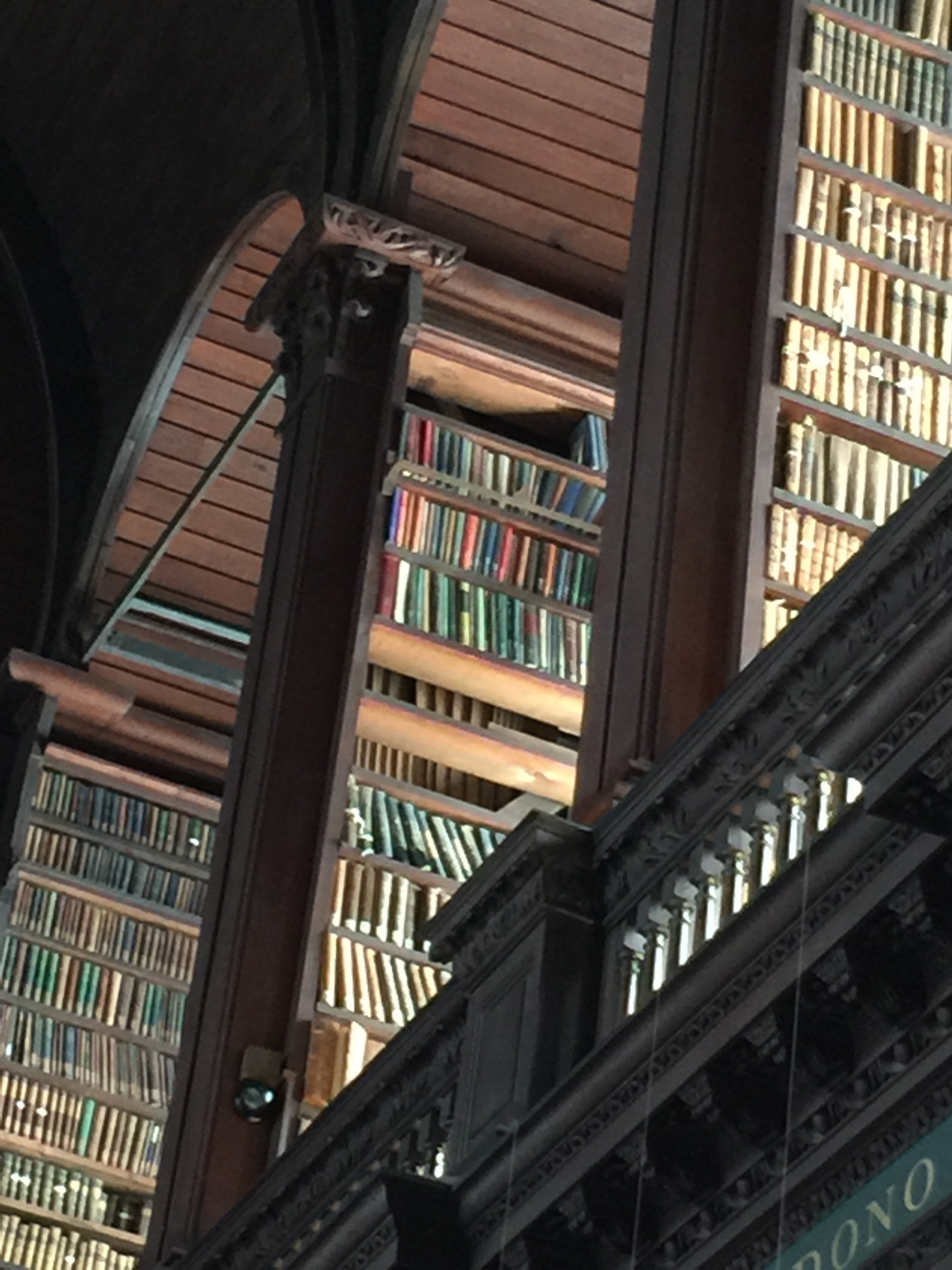We sat down on the center benches a few times to both rest and sit in awe of the beauty of this library. We did see the Book of Kells, but only briefly. There were so many people crowded around its display case that we mostly got a glimpse of the beautiful colors and artwork and moved on to the library itself.