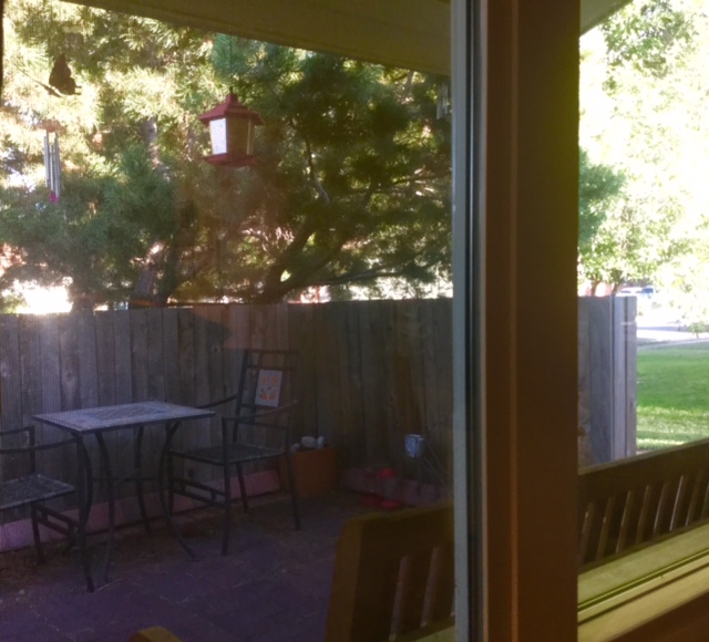 at the bird feeder hanging off the eave
