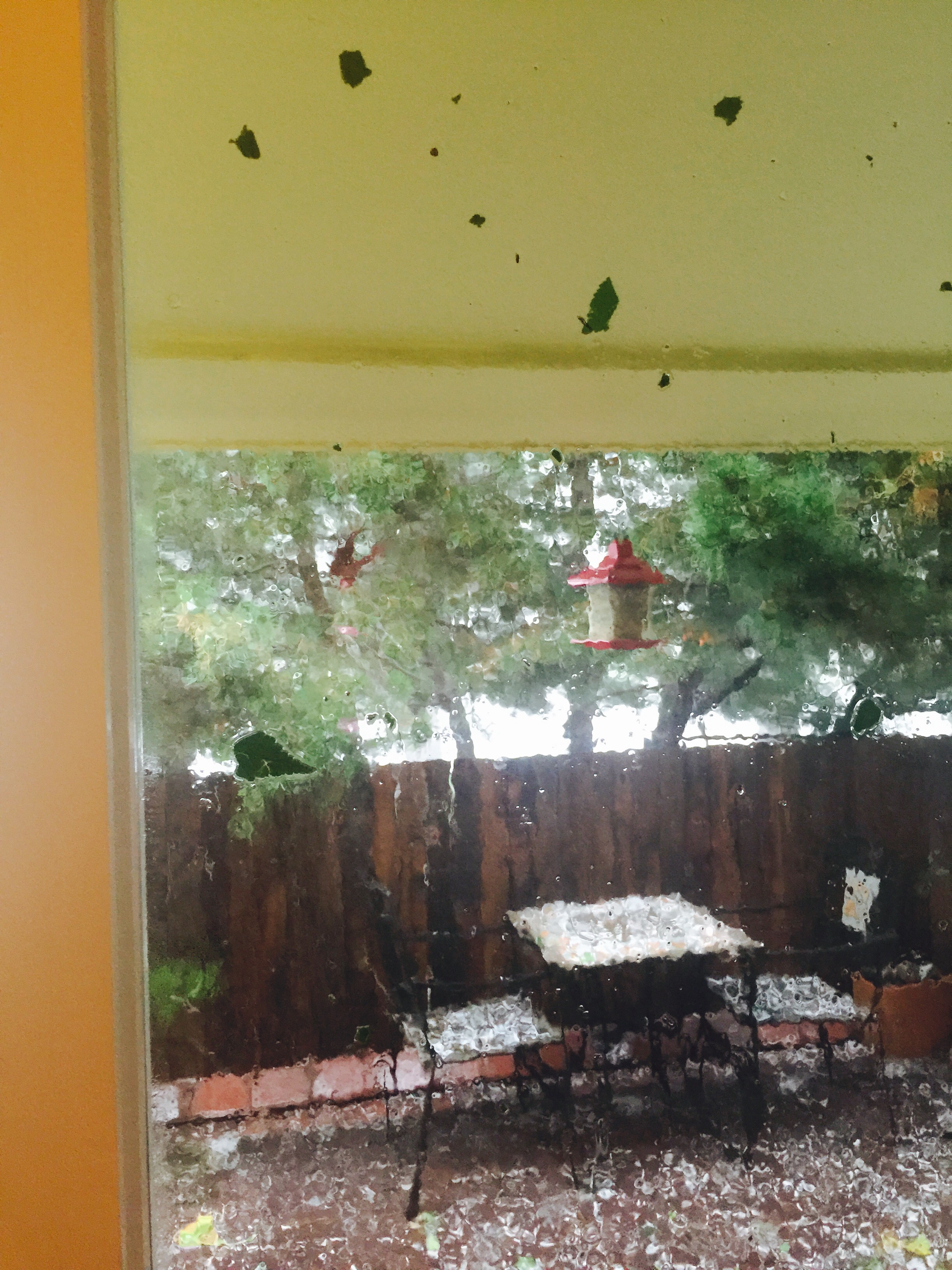 So, yesterday we had the biggest storm yet here at my house. At one point we were getting hail and rain from every direction and it was all hitting HARD! My cat tried to use me as a tree to escape the noise. I don’t know where she thought she was going, but apparently my body was her escape route! My dog just froze in the living room floor, not moving throughout the entire storm. It was quite fun! It looked like this in the middle of it all: