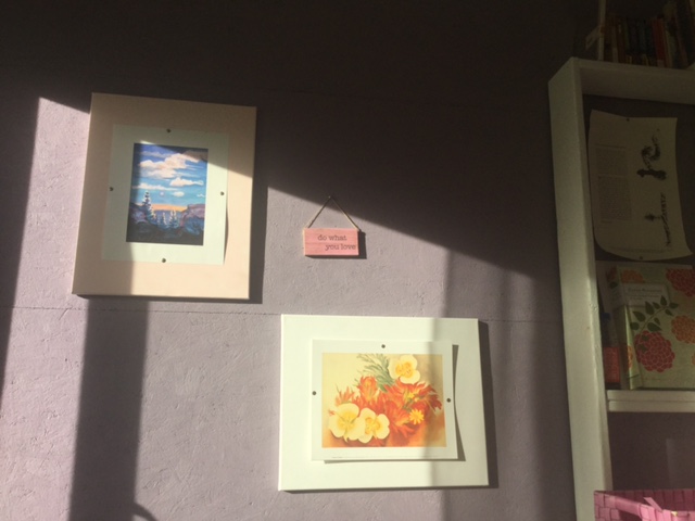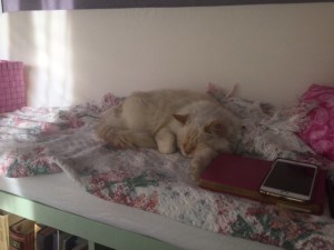 I came out to my studio to write this afternoon. I started off writing a quadrille poem (44 words long) that would include the word spark or sparkle for dVerse Poetry’s weekly quadrille challenge. I wrote as the breeze wafted through my open door and the sun slowly shifted to highlight the artwork on the wall opposite me. The air was not too hot and not too cold, but just exactly perfect. Missy Cat came inside and found a comfy place to snooze and suddenly I realized I had been staring off into space, halfway caught between a doze and a daydream. What a perfect afternoon and a perfect feeling of peace. I realized I was more relaxed than I’ve been in ages. Did I get a lot of writing done? No. Did I get a lot of plotting and planning done for the 50,000 word novel I’m writing for NaNoWriMo? I have to say I did. Isn’t it amazing how much one can accomplish when we simply take the time to get halfway caught between a doze and a daydream? Happy Monday everybody! Elaine